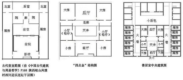 前廳--天井--后廳。后廳前廳兩側(cè)各一房,占居‘’四點(diǎn)金‘’的四角,這就是“四點(diǎn)金”名稱的由來。